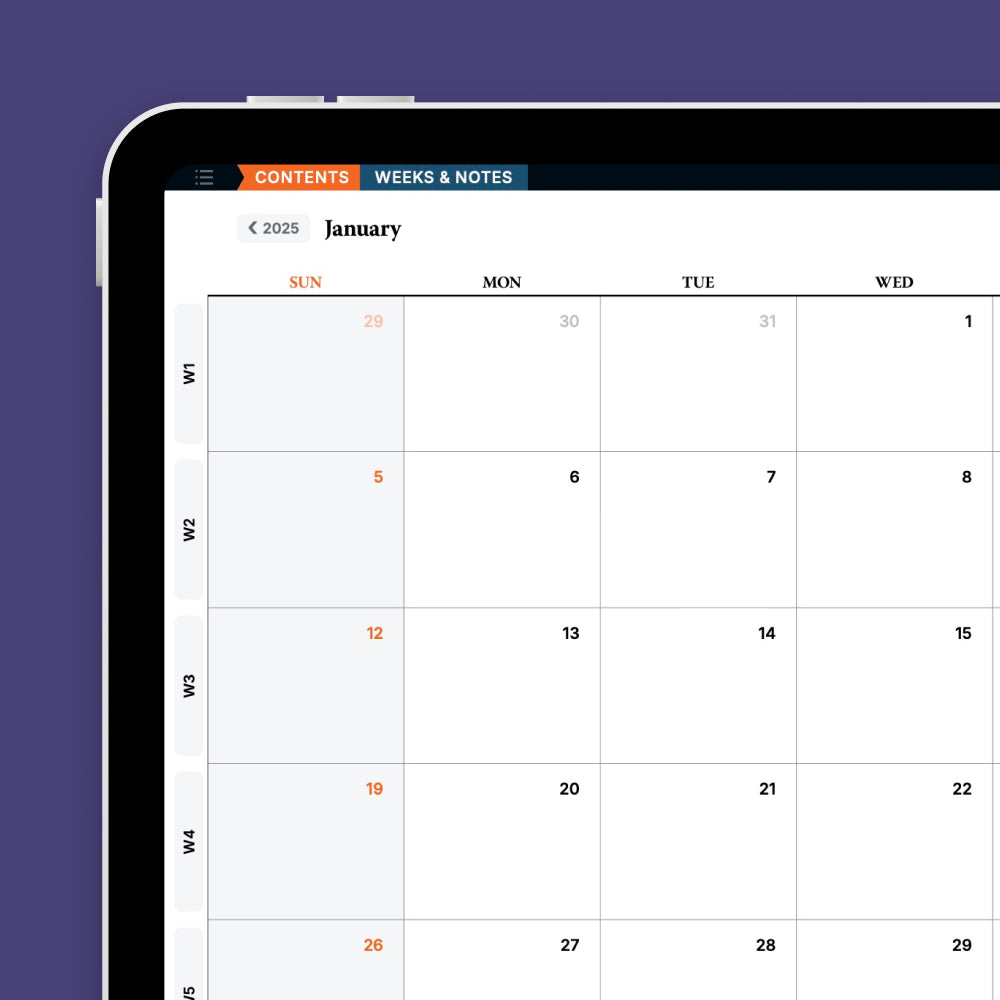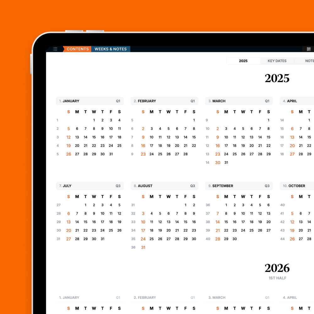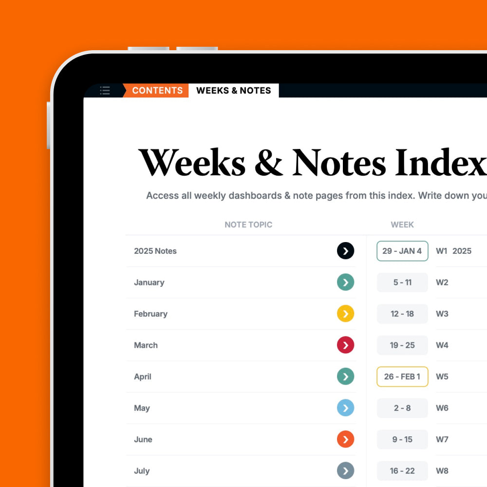 Each Month and Weekly template have their own dedicated dot-grid notes page, allowing you to take notes within context. To further organize your notes, use the 'Weeks & Notes Index' to index, find and revisit all your notes later on.