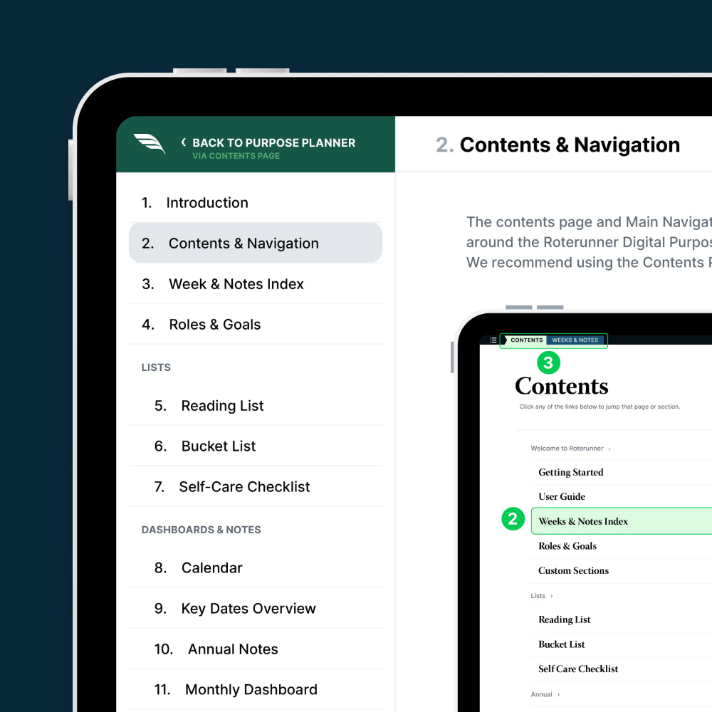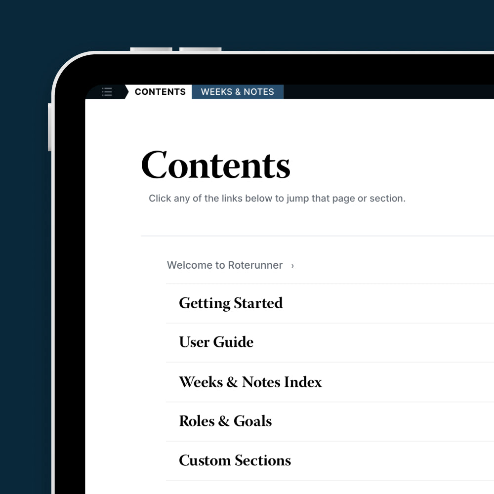 With the Contents Page and Weeks & Notes Index alone, you can access every corner of the Roterunner Digital Planner.