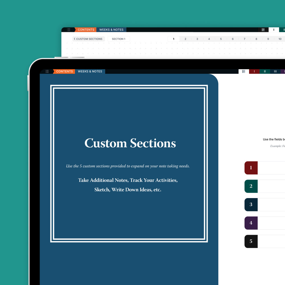 - 5 Custom Sections with 12 hyperlinked dot grid note pages for additional note taking.