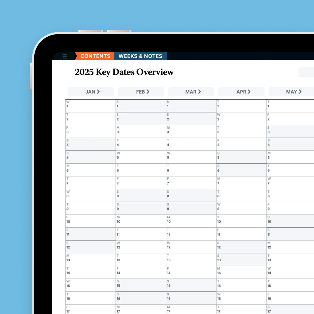 Each weekly row in the calendar is a clickable link, allowing you to go directly to that weeks respective template for deeper planning and focus.