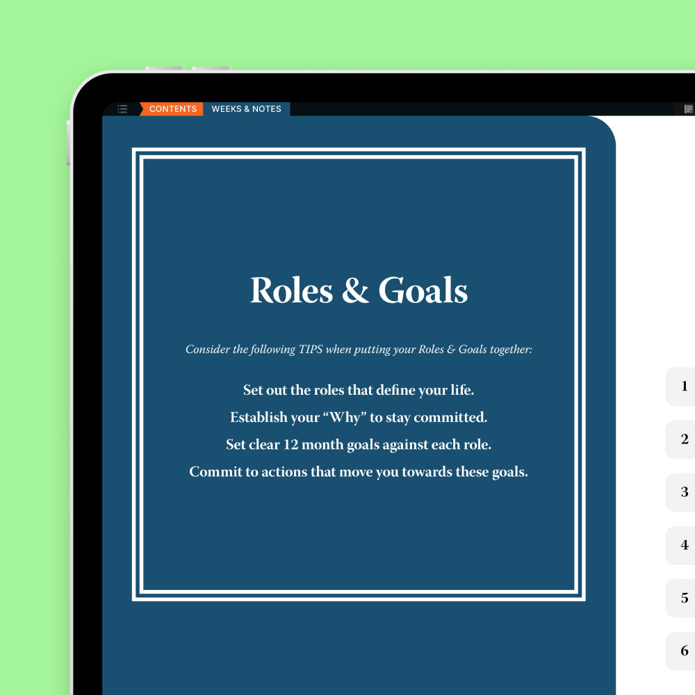 Jump to a desired section of the planner with a simple tap. From the contents page you can access the Notes index, Roles & Goals, Custom Sections, different Lists, Annual Templates and Monthly templates.