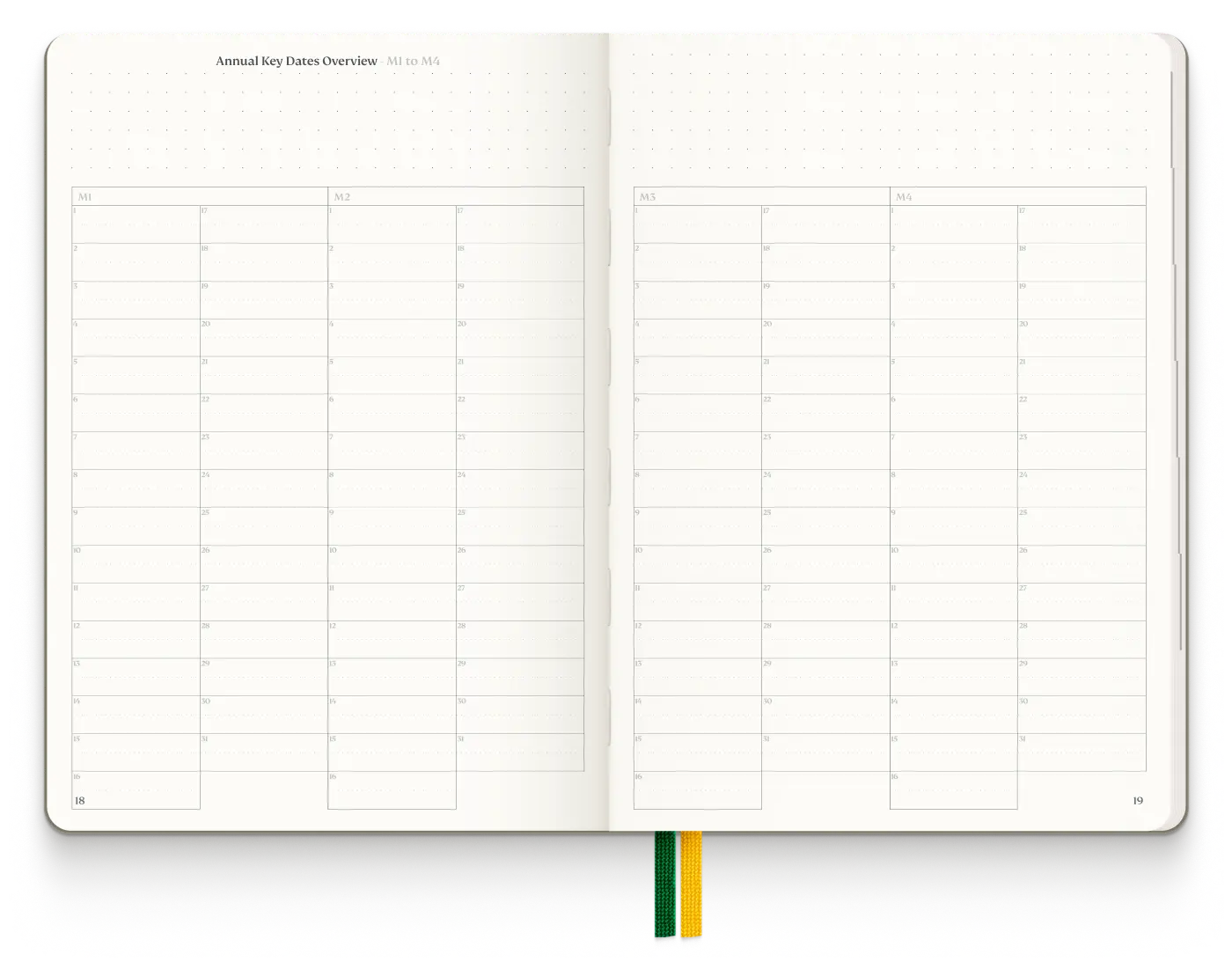Each weekly spread is followed up with two numbered blank dot grid pages to capture your notes, drawings or writing for that week. Offering a blend of both structured planning templates and free form note pages, the Purpose Planner includes additional note pages in the back for more note taking.