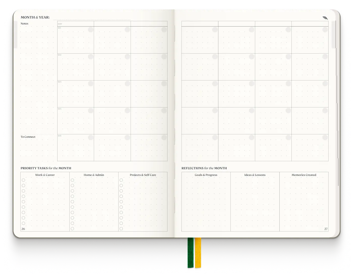6 monthly spreads provide a holistic view of your monthly goals, schedules and reflections. Connect your roles and goals to the projects and priorities that will define your month, pencil in your travel and meeting schedules and acknowledge your wins, learning, memories and affirmations that keep you motivated and focused.