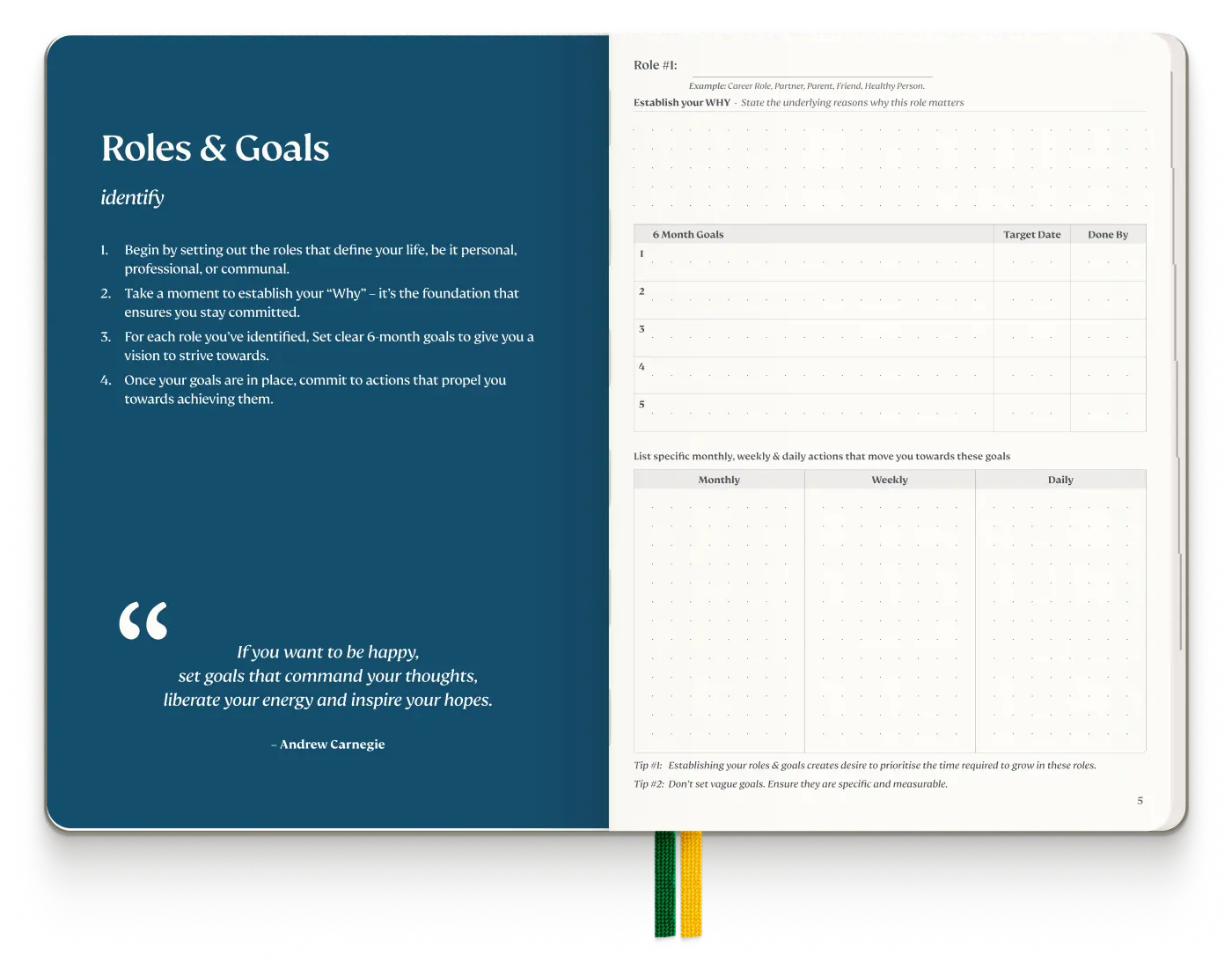 Set 6-month goals for each role to align personal/professional aspirations, track progress, and monitor accomplishments.