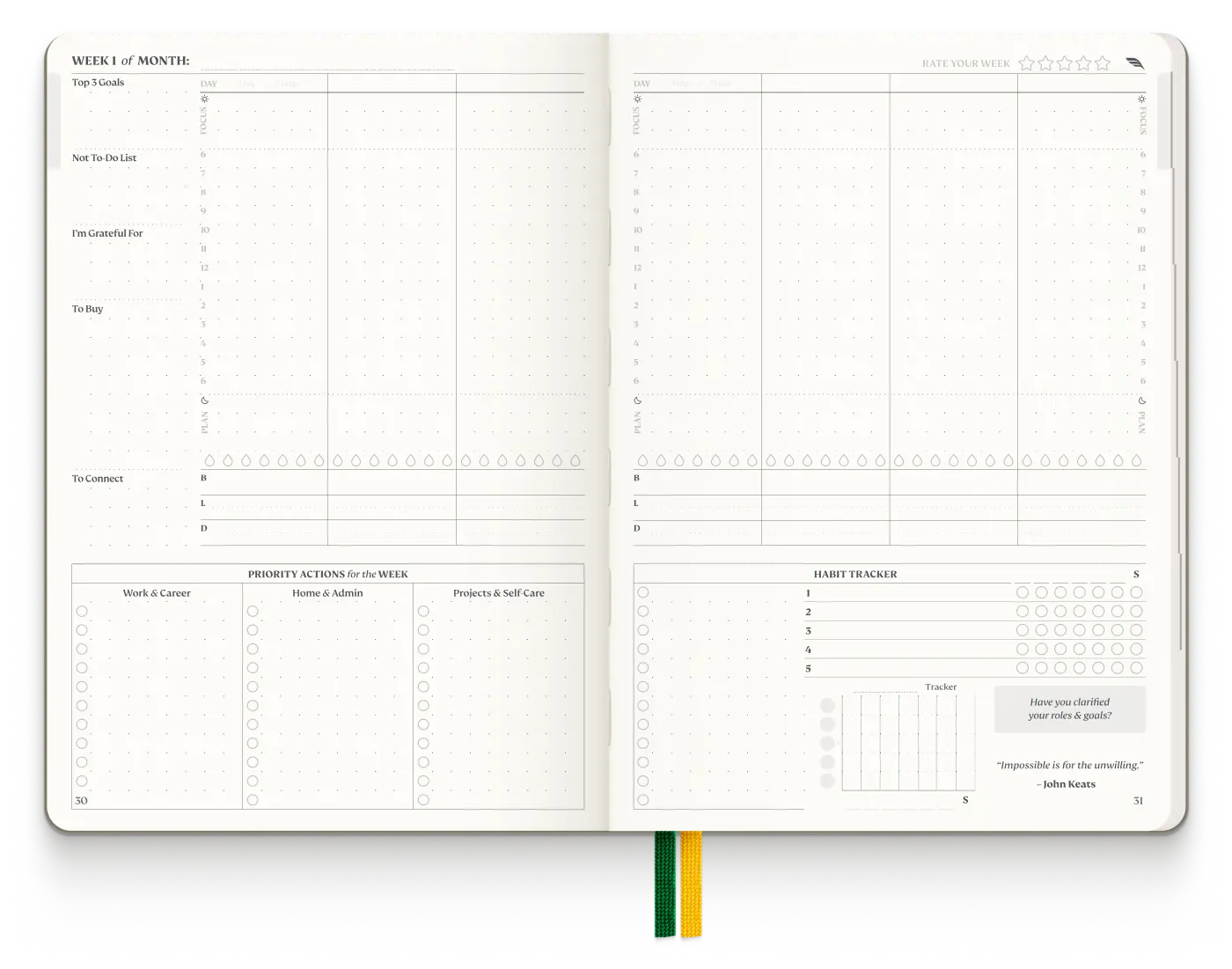 You will find yourself minimising “busy-work” while taking care of those annoying admin items that you typically procrastinate. The weekly dashboard also speaks to you. The sections that are left blank make you aware of the gaps in your life and it’s up to you to fill them in.