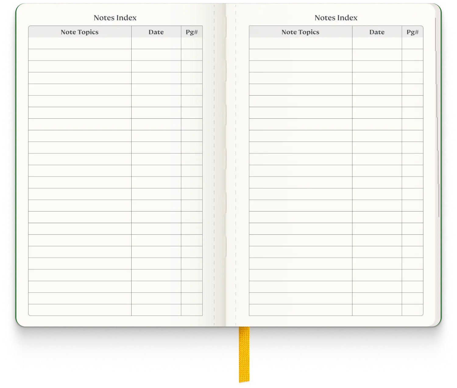 Keep track of your entries in the dedicated Notes Index by logging topics and page numbers, ensuring effortless navigation. This convenient index transforms your notes into a quick-reference system, saving you time and keeping thoughts at your fingertips.